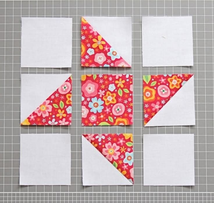 For a twelve-inch block, you will need one 4.5-inch center square, four 4.5-inch background squares, and eight 4.5-inch squares for the half-square triangles.